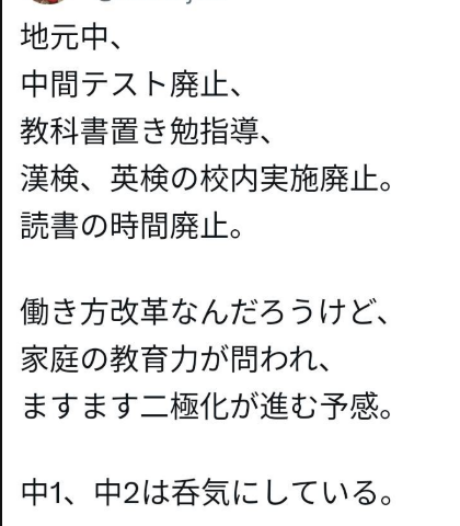 結局、 公立中学校はだめだってことで私立中学にどんどん流れるんだろうなと。むろん地域によりけりで公立中学でもしっかりとした教育をしているところもあります。実際に私の教え子ちゃん北海道の某地域の公立中学は先生方がとっても熱心でいい学校です。